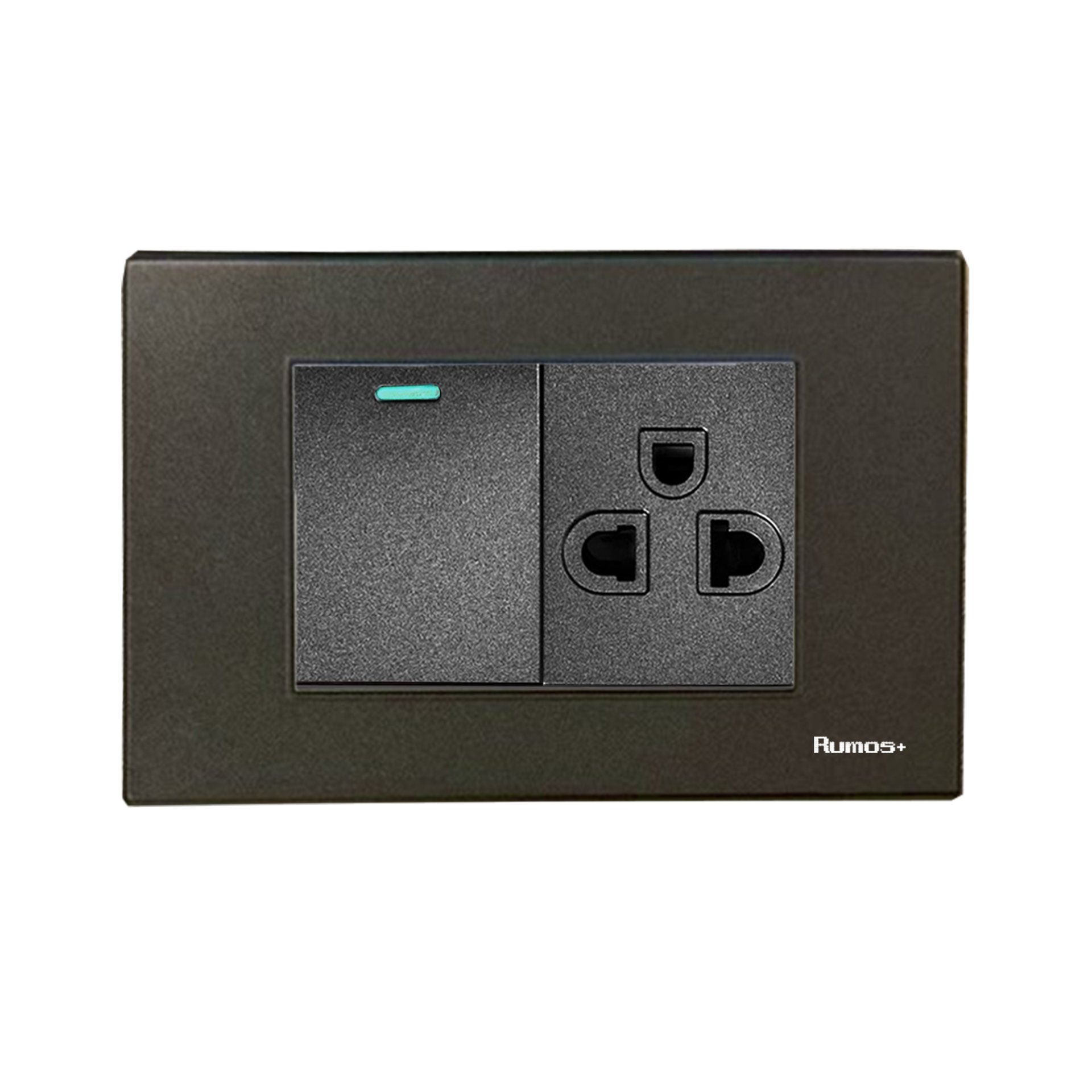 เต้าเสียบกราวน์เดี่ยว(มีม่านนิรภัย)+สวิตช์ไฟฟ้าแบบ 1.5G(ปุ่มกลาง)พร้อมกรอบพลาสติก สีดำ