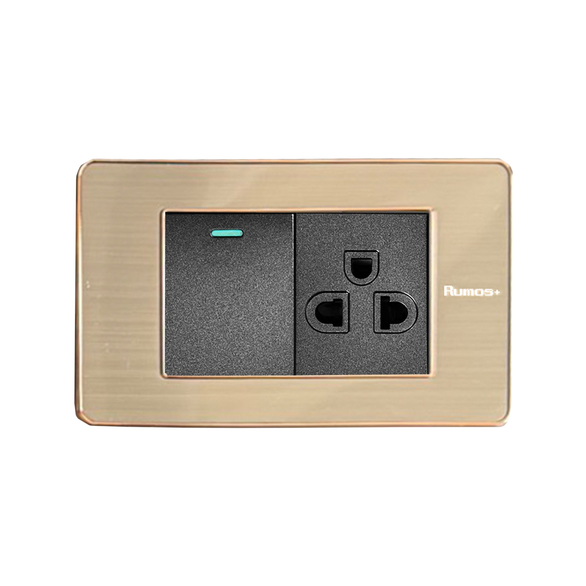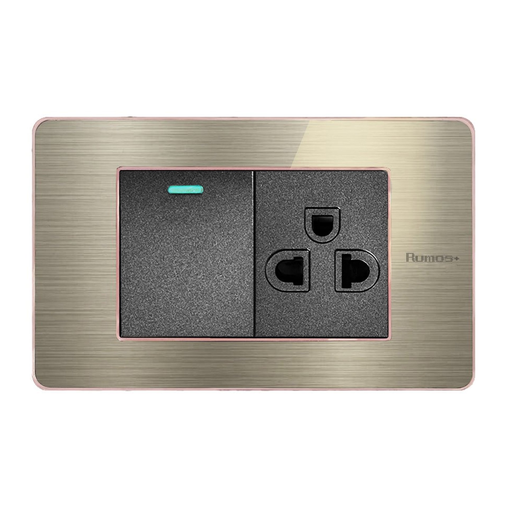 เต้าเสียบกราวน์เดี่ยว(มีม่านนิรภัย)+สวิตช์ไฟฟ้าแบบ 1.5G(ปุ่มกลาง)พร้อมกรอบสีโรสโกลด์